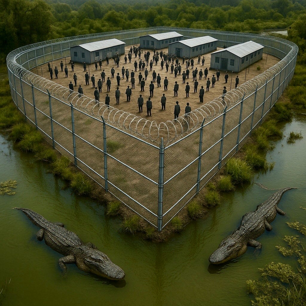 The Crackdown. Curfews spread. Protesters vanished. Families disappeared into detention centers. The most infamous — “Alligator Alcatraz,” a Florida detention island. Reports of torture, disappearances, and deaths circulated, evoking comparisons to humanity’s darkest prisons.